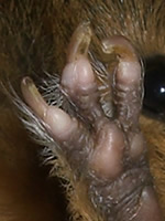 Meerschweinchen mit Brüchen dürfen keinesfalls getragen werden. Ein notwendiger Gesundheitscheck sollte in dieser Zeit besonders behutsam vorgenommen werden. - Schiefer Zeh auf Grund eines Knochenbruchs. Der Zeh wurde nicht geschient oder eingegipst, sondern wuchs ohne Hilfsmittel zusammen.