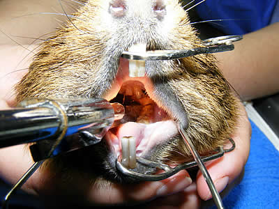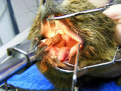 - Dieses Meerschweinchen hat seit Monaten extreme Zahnprobleme. Hier wird es gerade in einer speziellen Zahnpraxis behandelt. Das Meerschweinchen liegt in Narkose, das Maul ist mittels Maul- und Backenspreizer weit geöffnet, so dass der Tierarzt sich ein ausreichend gutes Bild des Zahnzustandes machen kann.