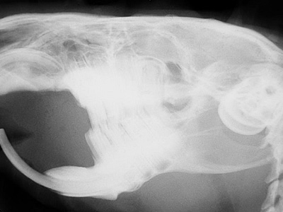 - Hier seht ihr das Röntgenbild eines Meerschweinchen-kopfes. (c) Dr. med.vet. Jochen Krüger www.tierzahn.de