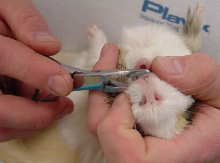 - Ein Meerschweinchen mit abgebrochenem Schneidezahn nach einem Unfall. Der Tierarzt muss den Zahn und gegebenenfalls auch den anderen Schneidezahn kürzen, so dass das Meerschweinchen richtig fressen kann.