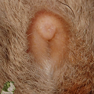 Das weibliche Geschlecht von Meerschweinchen hat die Form eines „y“. In der Mitte sieht man einen kleinen Punkt.