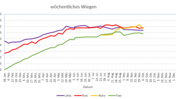 ich muss morgen früh unbedingt mal unter reellen Bedingungen, also morgens, vor der fütterung wiegen... ich bin neugierig was bei diesen werten realistisch ist