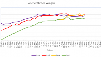 Das alte, nicht gut abgetrocknete, Heu ist so gut wie aufgebraucht und neues Heu ist da. Die Hefen und der Matsch sollten also der Vergangenheit angehören. Was ihre dicke Zehe betrifft so behandle ich sie seit einer Woche mit Bepanthen und einem kleinen Verband. Langsam stellen sich Erfolge ein. Ich bin darüber sehr froh, weil wir so vielleicht stärkere und schädlichere Behandlungsmethoden umgehen können.Rosi pummelt weiter und ist wieder 4-stellig. Eigentlich müsste ich Madame aber auf Diät setzen, was sich aber als schwierig erweist, weil sie natürlich nicht freiwillig weniger frisst. Alle auf Diät setzen geht auch nicht, weil mindestens Nora & Foxi zuzulegen haben.